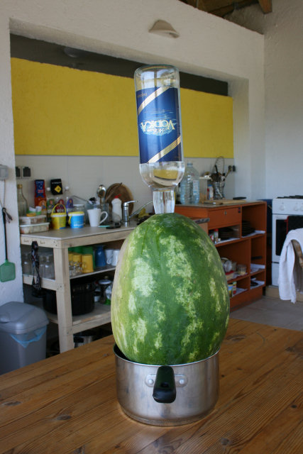 3. Put the neck in the hole so the vodka pours into the watermelon.